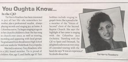 Stan Smith introduced Tia to Ray Eubanks, Director of the Columbus Jazz Arts Group (JAG), where she became one of the featured vocalists to perform with JAG’s 20-piece big band orchestra for many years. Tia was featured with Jag in several local festivals and events as well as some international performances in Spain and Denmark.